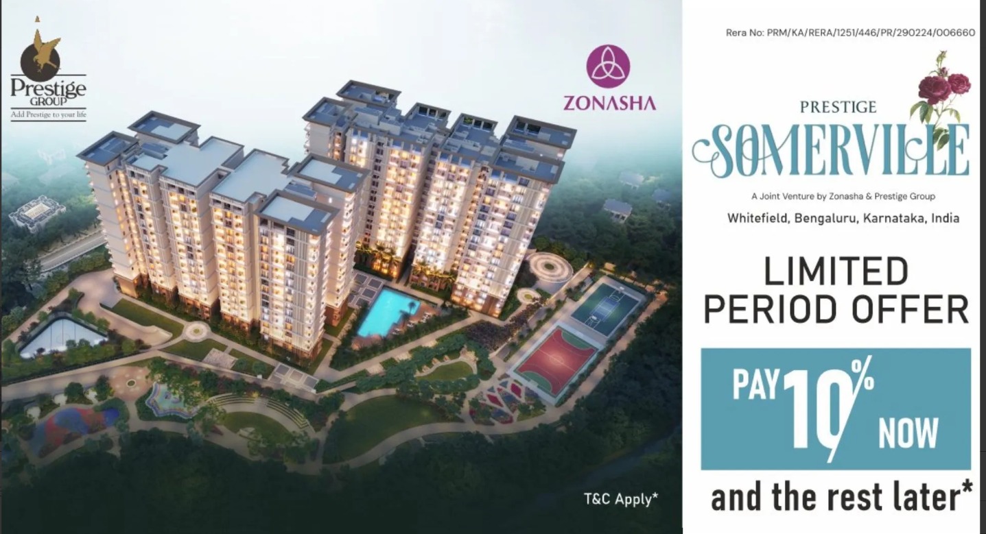 Prestige Somerville is a splendid, futuristic residential project on Whitefield Road in East Bangalore. The project is spread over 6.58 acres and comprises two high-rise towers hosting 306 apartment units in 2, 3, and 4 BHK configurations. The project hosts two towers with G+17 upper floors. The units range from 1203 sq ft to 3510 sq ft, offering ample space for comfortable living with luxury amenities.