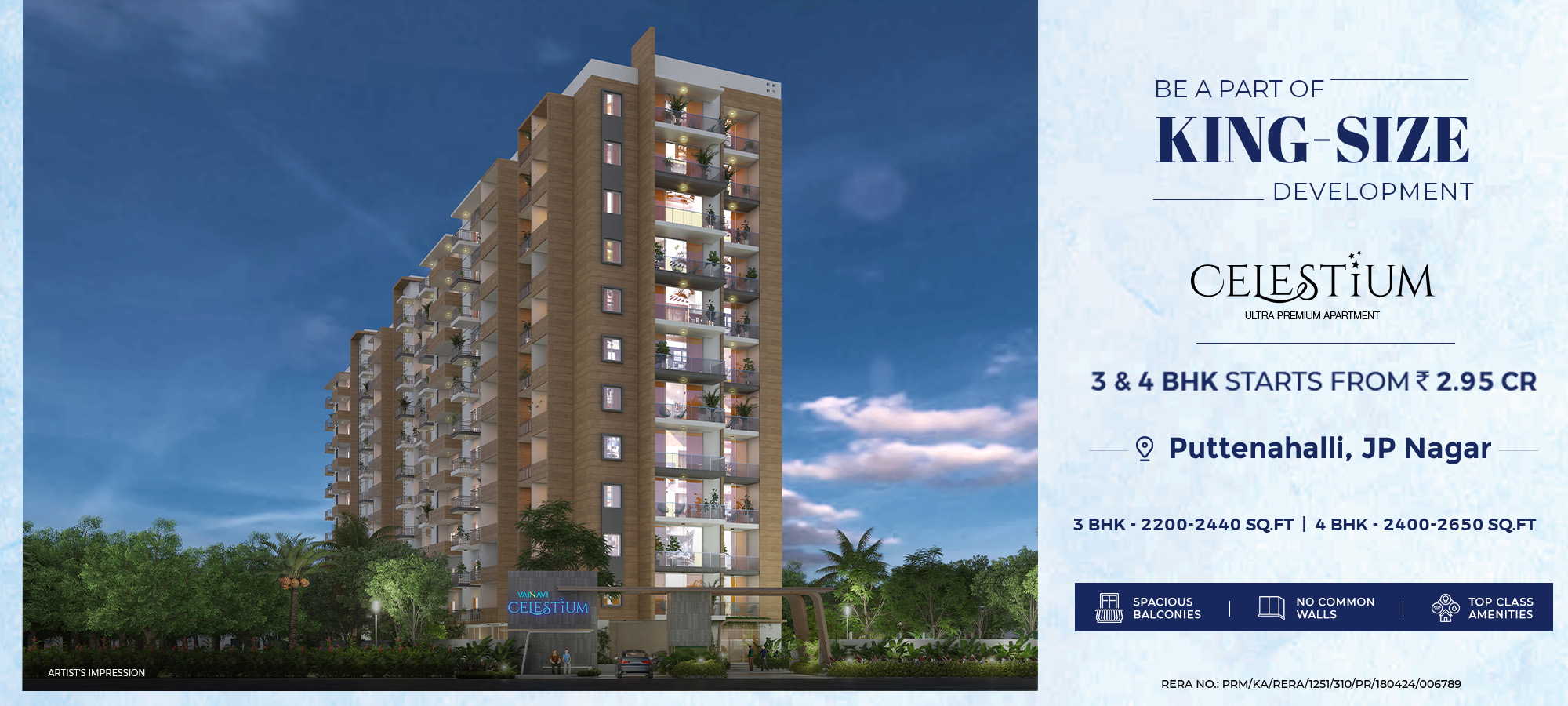VAINAVI CELESTIUM is an opportunity to achieve your dream lifestyle. It is a luxurious residential project designed to offer the perfect blend of modern living and comfort. Nestled in a tranquil environment, VAINAVI CELESTIUM boasts of well- crafted 3 and 4 BHK apartments that redefine elegance and sophistication. Built close to the well-known Sarakki Lake in an equally-vibrant JP Nagar, in the heart of Bangalore, VAINAVI CELESTIUM is a project housed in ground + 11 upper floors comprising 68 units at 6 units per floor. With 70% open space and no common walls, top-end quality flats are compatible to smart homes with contemporary interiors, premium fittings and natural light and fresh air, for that perfect blend of style and functionality.
